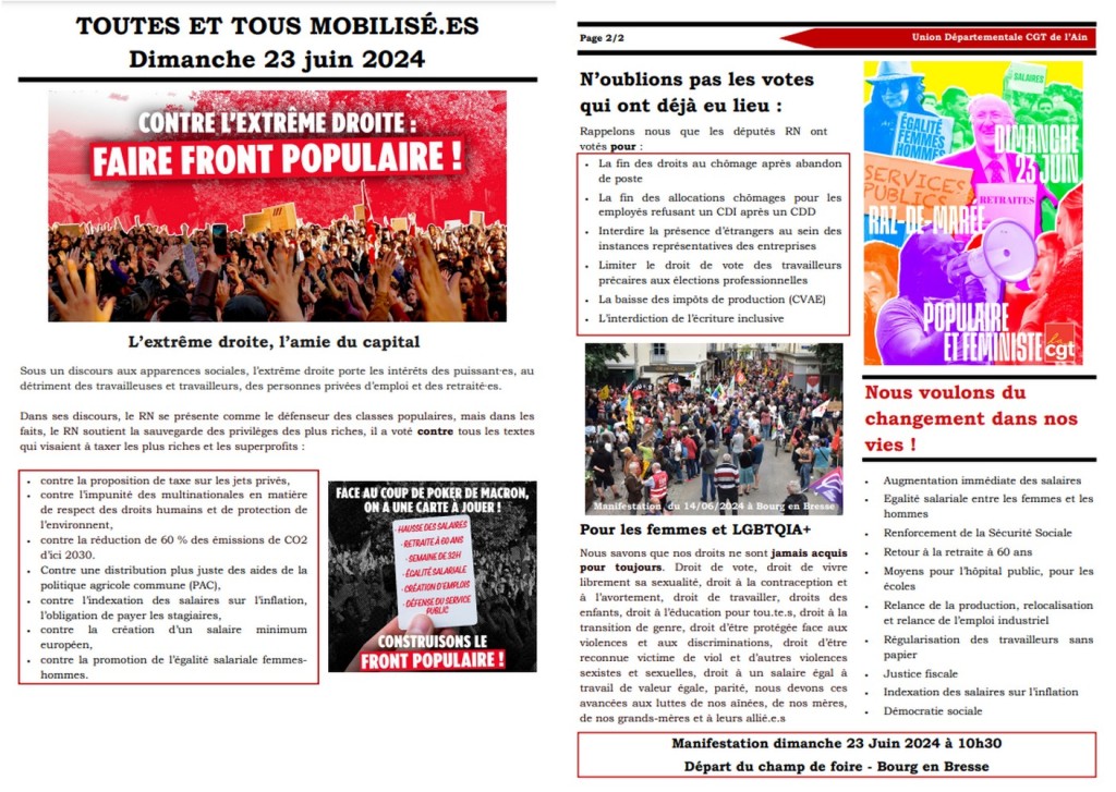 ………. en pièce jointe le tract relatif à la manifestation du 23 juin, à l’appel des organisations syndicales CFDT, CGT, FSU, UNSA et SOLIDAIRE, pour lutter contre l’extrême droite.