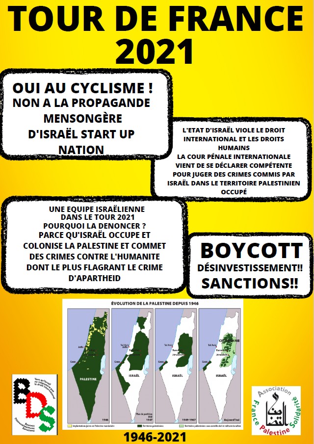 Cette année encore nous voulons dénoncer la présence de l’équipe « Israël Start Up Nation » dont l’objectif est de faire la promotion de l’État d’Israël et de prouver au monde entier « qu’Israël est une démocratie, un état sûr et normal » ! L’AFPS organise une manifestation.