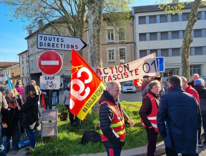 Une cinquantaine de personnes (militants syndicaux, des partis de gauche et du comité antifasciste de l’Ain) se sont rassemblés depuis huit heures , mercredi 26 avril 2023, devant le commissariat de Bourg-en-Bresse. Ils sont venus apporter leur soutien à cinq de leurs camarades convoqués par la police.