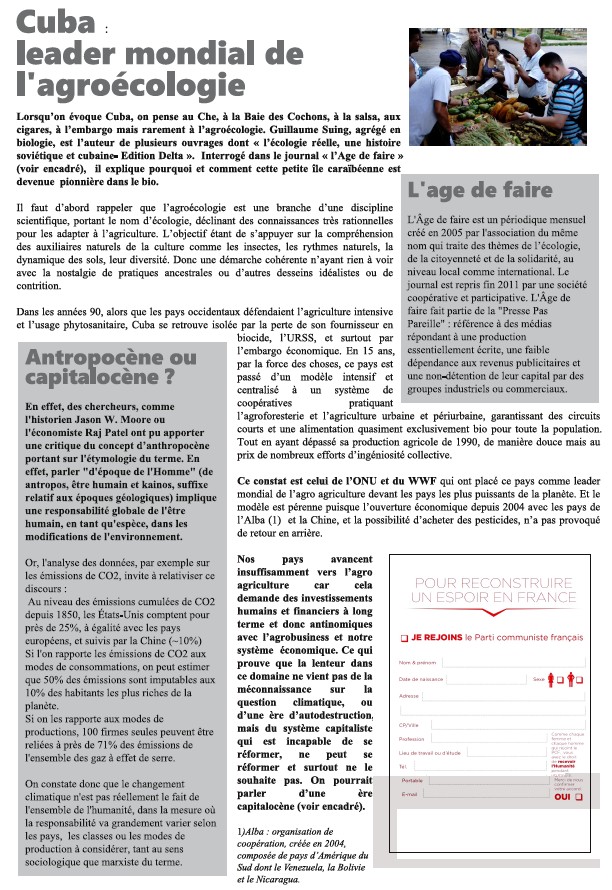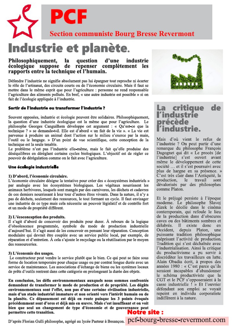 « Le PCF propose que la France consacre 100 milliards d’euros à un fonds écologique et social financé par l’État, l’Union européenne et les entreprises. Et que toutes les aides publiques aux entreprises soient conditionnées à des critères écologiques et sociaux précis. » Relocalisons nos productions pour réduire les besoins de transport longue distance des marchandises ; Développons un service public ferroviaire, fret et passager, en réduisant notamment le prix du billet SNCF pour les usagers ; Amplifions la gratuité des transports en commun et rejetons toutes les privatisations des réseaux ; Investissons 10 milliards d’euros par an pour la rénovation thermique des bâtiments ; Mettons un terme au projet Hercule visant à privatiser la production d’énergie; Créons un pôle public de l’énergie, autour d’EDF, 100 % public Abrogeons tous les accords de libre-échange type CETA et Mercosur et adoptons une loi favorisant les circuits courts ; Agissons pour un mix énergétique, permettant la décarbonation totale de toute l’électricité ; Protégeons la biodiversité en France et dans le monde. Dimanche 9 à Bourg : départ 14 h. devant la Tannerie