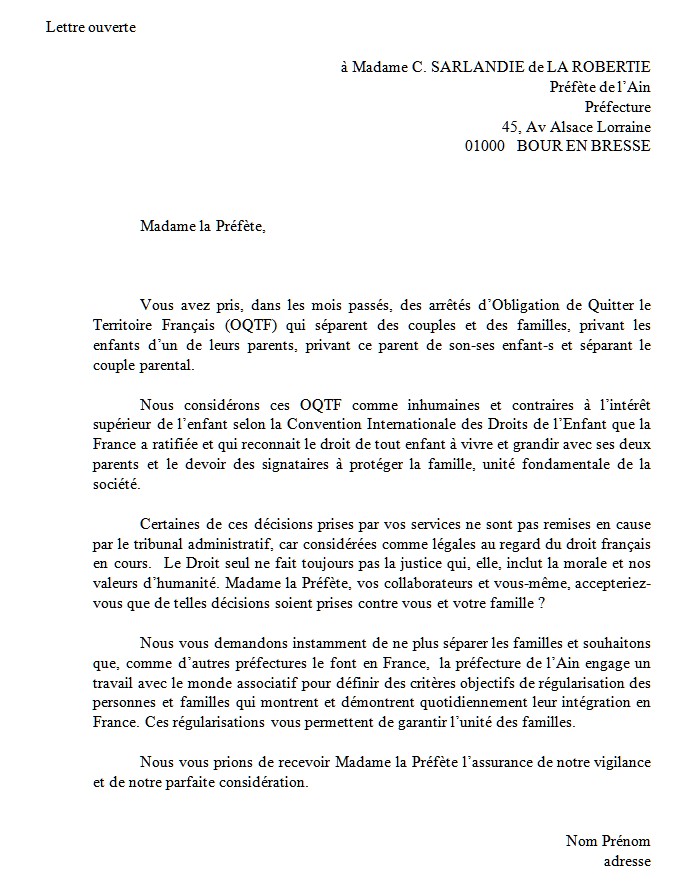 objet : Séparation des familles : Lettre ouverte à la préfète